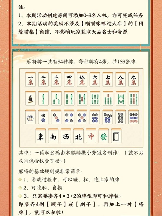 3、只需要凑齐4x3+2的牌型即可和牌啦-即集齐4副【顺子】或【刻子】,再加上一对【将牌】,就可以和啦!