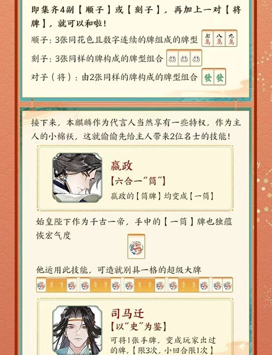 本期川麻为4人麻将,使君在开局时随机分配2位名士,可选择1位名士进行游戏玩法包含:【普通模式】、【技能模式】两种模式