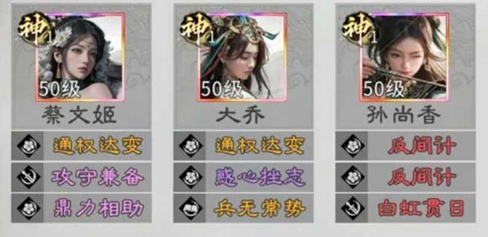 推荐的阵容是“孙尚香双辅追击流”,由孙尚香作为唯一核心输出,搭配蔡文姬和大乔两名辅助武将。蔡文姬的作用是为队伍提供战法减伤、怒气回复和群体增益效果,保障队伍的生存与运转。大乔则负责给敌方施加如【禁疗】、【缴械】等关键的负面状态,同时提升全队的暴击伤害。