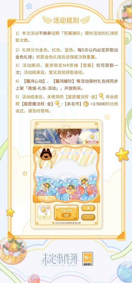 活动期间,律师可通过购买活动限时礼包或消耗【未名晶片】获得的【星愿魔法杖·金】抓取各色礼球。每个礼球将在抓取后自动转化为【女神之泪】、【未名晶片】、升级素材道具等随机奖励;累计抓取10个金色礼球即可获取夏彦限定MR思绪【雪幕】