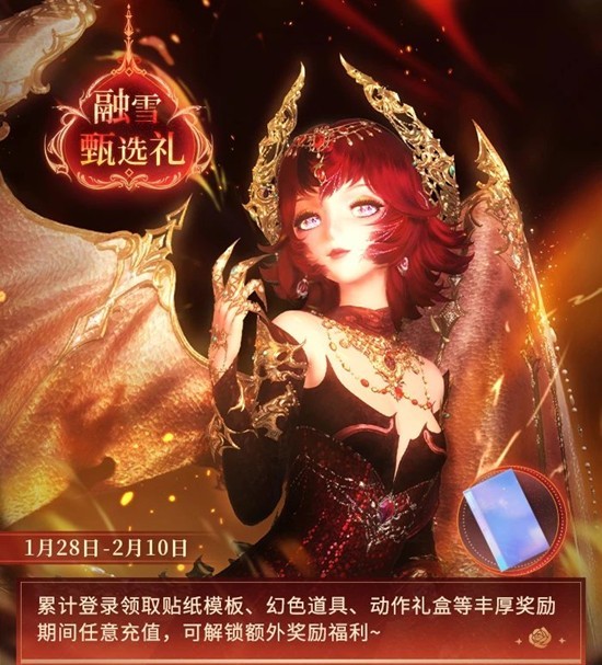 1月28日更新后,融雪甄选礼累登福利活动开启,登录即领贴纸模板、动作礼盒等奖励。