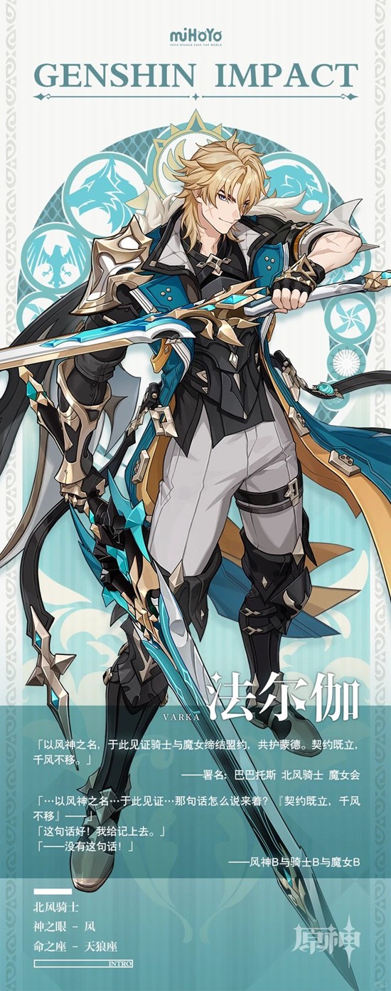 《原神》官宣6.4版本新角色法尔伽,这位铺垫五年的西风骑士团大团长终于迎来实装,将于1月下旬上线。他是五星风系双持大剑角色,命之座天狼座,也是原神首个双持大剑作战的角色,立绘中双剑造型设计极具特色。
