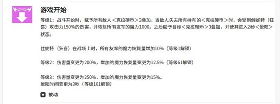 游戏开始时,佳妮特的被动技能会使敌人身上的克拉硬币状态更容易叠加。当敌人失去该状态时,会受到佳妮特攻击力150%的伤害,并为一名队友回复1000点魔力,同时使敌人眩晕2秒。她的终极技能会释放狂喜之力,在16秒内提升全体友军40%的防御力和攻击力,并使所有敌人在12秒内处于出血状态。