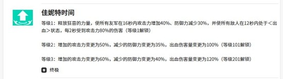 佳妮特的第一个技能会为所有友军施加一个持续12秒的护盾,该护盾能够吸收相当于佳妮特攻击力200%的伤害。同时,技能会为佳妮特自身附加嗜血状态,并在接下来的8秒内,除了佳妮特以外的所有友军都会获得一个场内永久持续的“表演时间”状态。