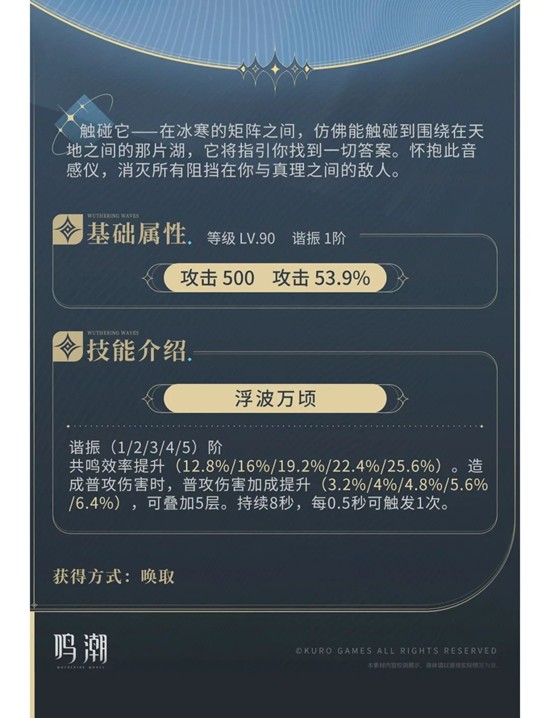 攻击588,暴击24.3%。攻击提升12%。对处于【集谐·干涉】状态的敌人造成伤害后,普攻伤害加成提升6%,持续3秒,可叠加4层,每0.5秒触发1次,重复触发时刷新持续时间。这把武器适合需要持续叠加伤害的战斗场景,暴击属性也能有效提升输出期望。
