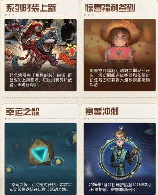 旧岁千般皆如意,新春万象皆更新。《第五人格》将于1月29日进行停服维护,春节主题版本内容重磅上线!本次更新不仅迎来往期春节活动商店道具全面返场,更开启「怪诞集」系列稀世时装上架、购物换礼、赛季冲刺等多重福利活动,为庄园的春节氛围再添一把炉火。