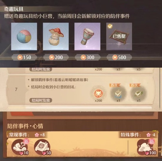 第一只什么都不用干,在商店里买盒子游戏这个玩具,月龄小的时候,每个月日程四个都玩盒子游戏就好(加好感度给那个货币,货币达到3万5的时候有粉钻拿,所以前面的巨兽不怎么上课的时候要尽力多的加好感度)好感度达到七级后,可以解锁羁绊事件能加100好感度,后面随意发挥,只要保证最后巨兽的总属性,在600以下,并且没有达到b的就好,可以达成第一个结局。