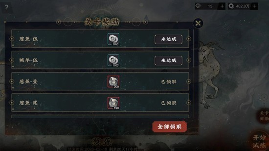 ※ 「异兽录」“羬羊”、“葱聋”关卡开启后,「异兽录」“奢比”、“狰”关卡将关闭,常驻试炼【岁引干支】、【龙吟凤引(上)】、【龙吟凤引(下)】可在试炼场界面左下角进行切换。