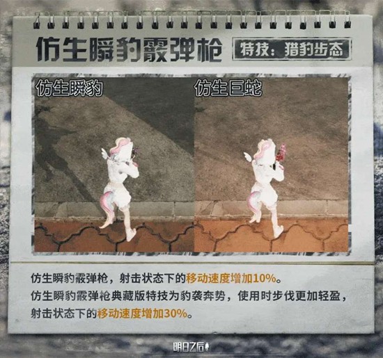 天下武功,唯快不破。明日之后仿生瞬豹霰弹枪典藏版更拥有【猎豹疾速步态】特性——在射击状态下,移动速度提升高达30%。这意味着幸存者可以在开火的同时保持高速机动,彻底告别"站桩输出"的被动局面,真正实现"打完就跑"的游击战术,在PVP对抗中占据绝对主动权。