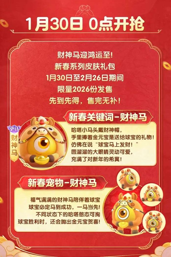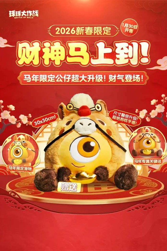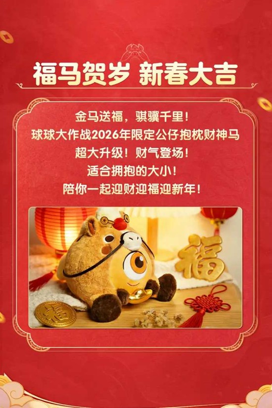 哈塔怀里抱,财神马上到!球球大作战2026马年新春限定公仔「财神马」迎来超大尺寸升级,财气满满登场!1月30日今晚0点准时开抢,超绝抱枕大小手感max,还赠送好运福卡,陪伴球宝新年迎吉祥!