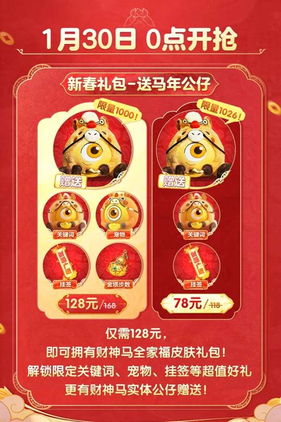 1月30日今晚0点,球球大作战财神马公仔准时开抢!超大尺寸限量发售,想将这只财气满满的哈塔抱回家?记得蹲点守候,手慢无!