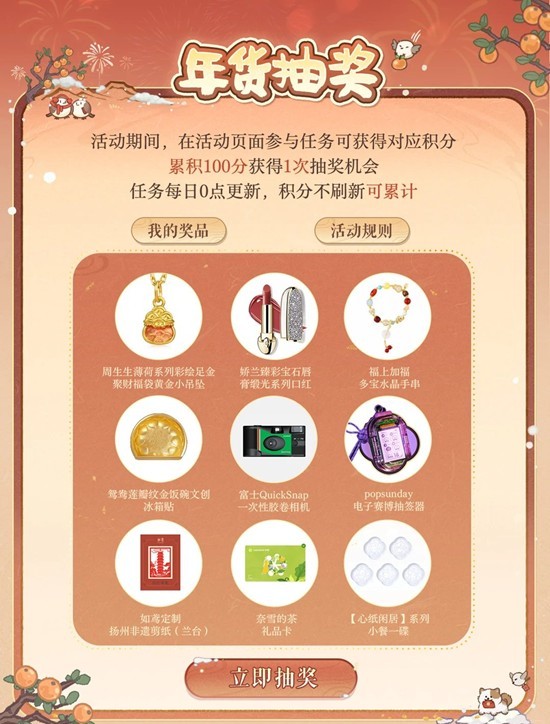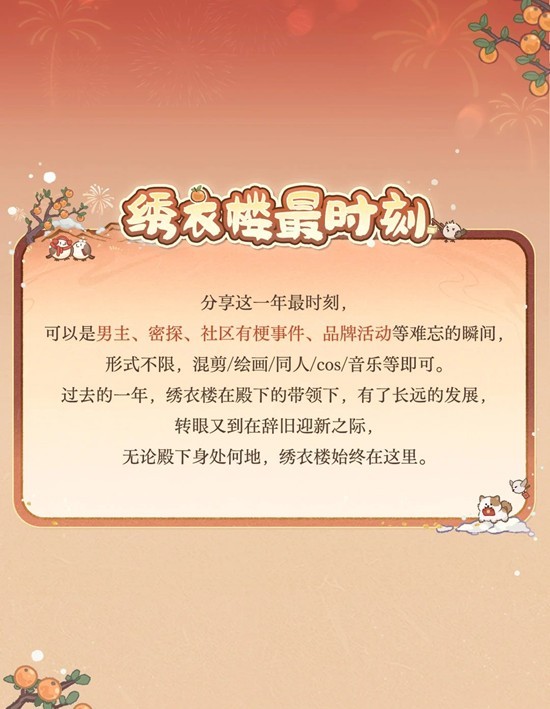 参与方式:分享这一年的最时刻,内容包括但不限于男主、密探、社区有梗事件、品牌活动等难忘瞬间,并带#如鸢 和#绣衣楼好饭吃到年 双话题发布,即可参与活动。完成活动任务集积分,可解锁抽奖机会。