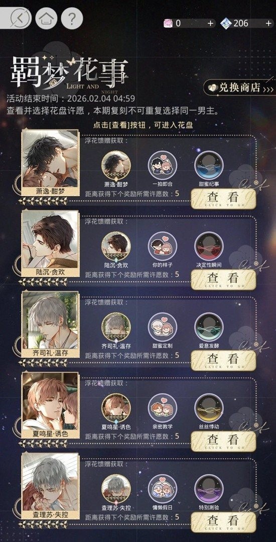 光与夜之恋羁梦花事 [复刻Ⅰ]限时返场将连续开启二期,每期可【自选】一位男主的花盘许愿,选择花盘后,将同步选择对应男主的朝花夕饰 [复刻Ⅰ]活动。那么这一获得礼盒应该怎么买呢?小编为你准备了一份攻略,一起来看看吧~