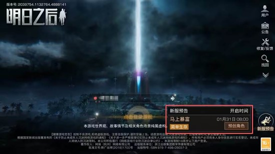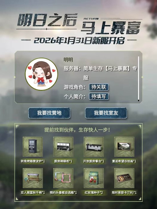 幸存者们大家好!明日之后全新简单生存专服【马上暴富】即将来袭,1月31日8:00正式开放。截止至今天18:00前,幸存者均可前往游戏内进行预创角,提前寻找室友、营地,或创建营地,即可领取限时精美奖励!