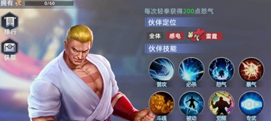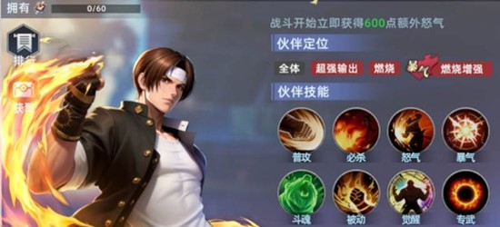 草薙京是这套全明星觉醒阵容的核心输出。他的必杀技拥有可观的高倍率单体伤害,释放后能为自身附加火焰护盾,使攻击他的敌人被点燃。当攻击已处于燃烧状态的敌人时,草薙京能造成更高的伤害。他的怒气技能则可以对全体敌人施加一层燃烧效果,为后续的伤害加深奠定基础。