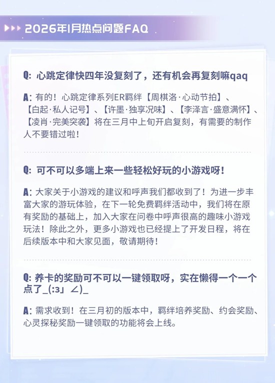 2月双节即将袭来,经过恋与制作人制作组茶水间多日的“秘密钻研”,他精心准备的过节计划即将揭幕,请务必期待哦!恋与制作人2月活动规划和1月热点问题FAQ也一并奉上,请查收~