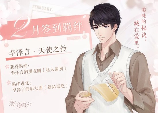 以上就是恋与制作人2月签到活动可获得羁绊李泽言 · 天使之铃的全部内容了,更多游戏资讯,攻略内容敬请关注切游网,您的支持是我们努力的动力!