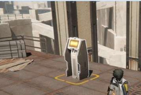 仔细观察周围的平台环境,在附近的一处平台上可以发现一台可操作的控制机器。这台装置是解开谜题的关键道具,在明日方舟终末地的工业设施中经常出现这类用于移动重物的机械。靠近机器后会出现交互提示,准备进行下一步操作。