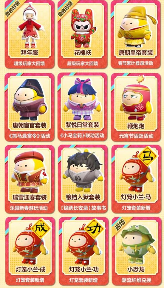 主题套装:拜年服、花棉袄、唐朝皇帝/宦官套装、紫悦日常套装、灯笼小兰系列等十余款。