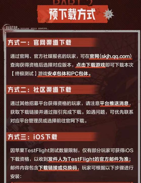 iOS端测试资格通过苹果官方TestFlight平台发放,幸存者需使用报名问卷中填写的邮箱接收邀请邮件。该邮箱将作为唯一凭证,不可更换。若需更换邮箱,必须联系管理员处理。由于苹果TestFlight测试数量限制,iOS下载资格有限,未获得iOS资格的幸存者仍可前往PC端或安卓端体验,三端数据互通且资格互通。