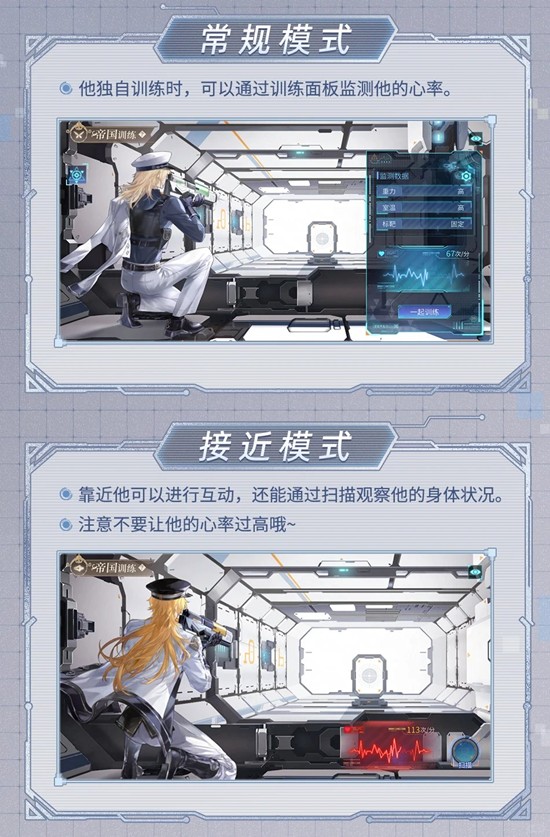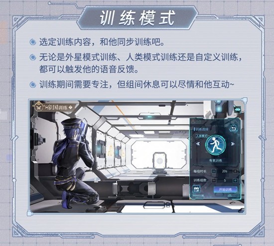 ►[训练模式]:选定自己的训练内容,和他同步训练吧。训练时可以触发他的语音反馈,组间休息可以和他尽情互动。