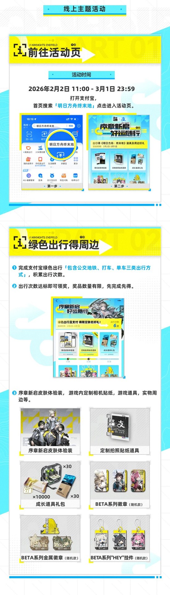 二、【明日方舟:终末地 × 支付宝】活动即将开启,2/2起参与活动完成对应任务,可兑换游戏内定制拍照贴纸道具、实物周边、定制全端皮肤(体验装)等奖励