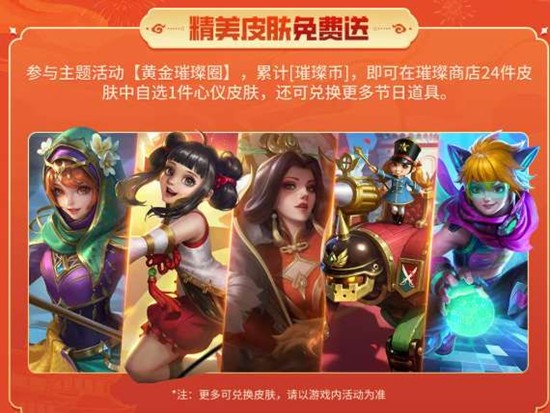 通过参与【黄金璀璨圈】主题活动,累计活动积分即可在【花火·潮街靓装】与【花火·星月琉璃】两款全新皮肤中任选其一。同时,累计【璀璨币】可在璀璨商店24件皮肤中自选1件心仪皮肤,还能兑换更多节日道具。2月17日起登录游戏领取代币,更可免费兑换【福泽宝箱】随机获得1个皮肤。