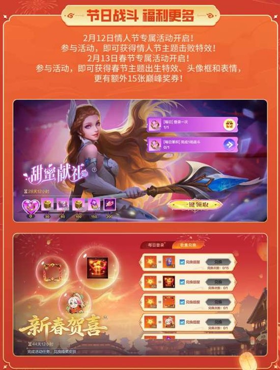 决胜巅峰在2月7日至8日开启巅峰周末狂欢升级活动,完成登录与战斗任务可额外获得5张巅峰奖券。2月12日情人节专属活动开启,参与活动即可获得情人节主题击败特效。2月13日春节专属活动正式开放,玩家可获得春节主题出生特效、头像框和表情,同时还能领取额外15张巅峰奖券。
