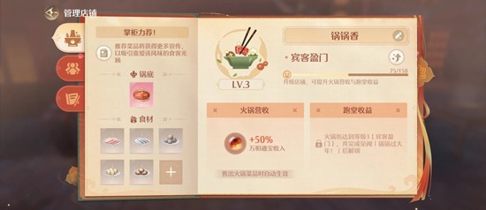 食客好感度:管理店铺-食客图鉴,可以看到每个食客想吃啥的,投其所好