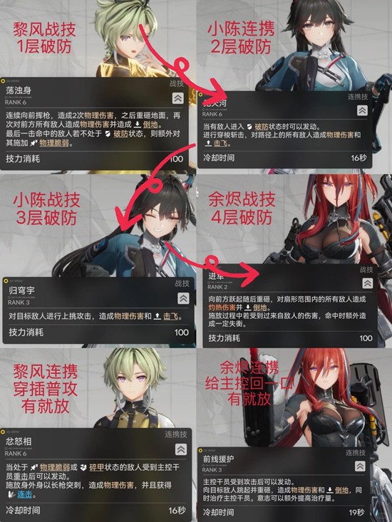 第一阶段(叠4层破防):骏卫普攻间隙,黎风战技起手-小陈连携-小陈战技-余烬战技,这个部分主要是通过素质连(破防,倒地,击飞等物理异常累积破防层数,叠到最高4层),期间穿插黎风,余烬连携(黎风打点输出,余烬为主控回一口保证续航)