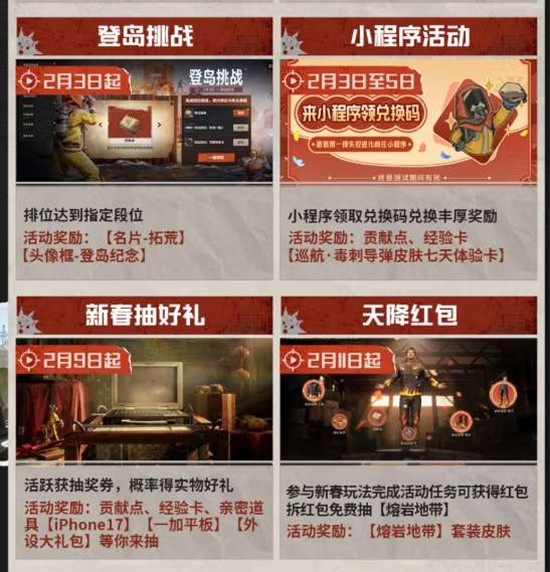 参与新春玩法完成活动任务,即可获得大量红包。拆红包有机会免费抽取【熔岩地带】套装皮肤,新年穿新衣,红红火火战沙场。