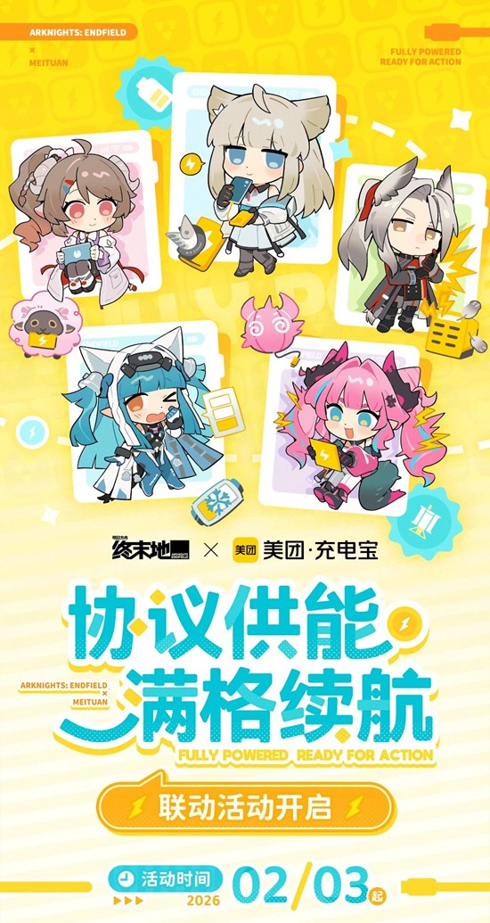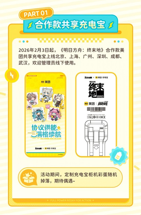 2026年2月3日起,《明日方舟:终末地》合作款美团共享充电宝上线北京、上海、广州、深圳、成都、武汉,欢迎管理员线下使用。