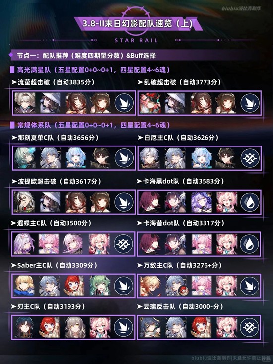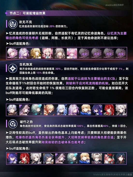 大buff较适合击破与记忆体系,这两种体系在本期也能取得很高的分数;上半需注意小buff泛用性有限,没有合适buff的配队可考虑buff3,提速对于末日幻影这样统计行动值的关卡也有一定效果;下半则需注意buff2会与死龙残躯的机制相吻合;主打战技输出的体系可优先考虑;