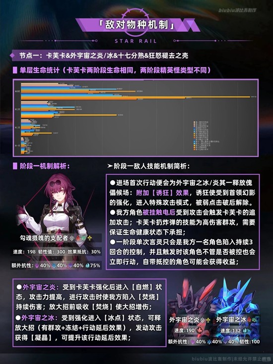 重点在下半,下半间首先需要带治疗角色以应对【垂死挣扎】状态,其次对于这种共享生命的角色群攻或扩散输出的角色更优;另外下半boss每多一弱点受到的伤害均会提高,因此能挂弱点的那刻夏、银狼等也会有一定优势;至于击破队如果有大丽花来应对锁弱点状态的死龙就也能取得不错的分数;