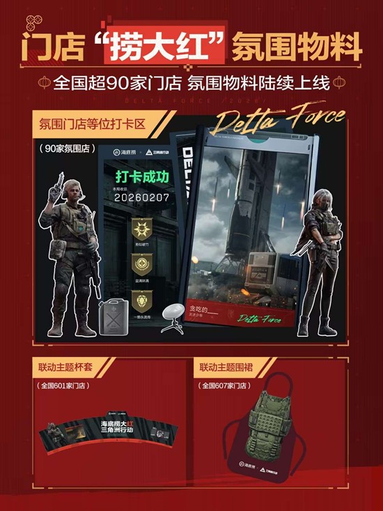 2月4日起,联动套餐预售正式开启!2月7日活动全国上线后,玩家可前往海底捞门店或外送平台选购"捞大红"联名套餐,在家也能享受"搜打撤"的联动氛围。这是《三角洲行动》与餐饮品牌的深度跨界合作,"海底捞大红,三角洲行动"的口号更是将游戏经典元素与火锅文化完美融合。