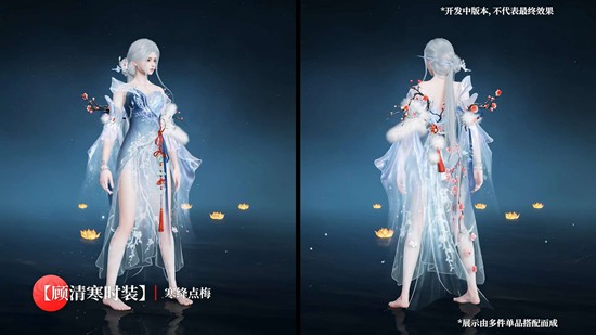 顾清寒【寒绛点梅】:浅蓝外袍覆雪红梅,寒梅疏影素衣白纱,搭配极品发型【落梅】与挂饰【栖寒华】。