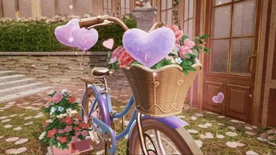 玫瑰金的车身线条流畅优雅,车篮里满载着馥郁的春意,粉紫色的气球在风中微微摇曳。