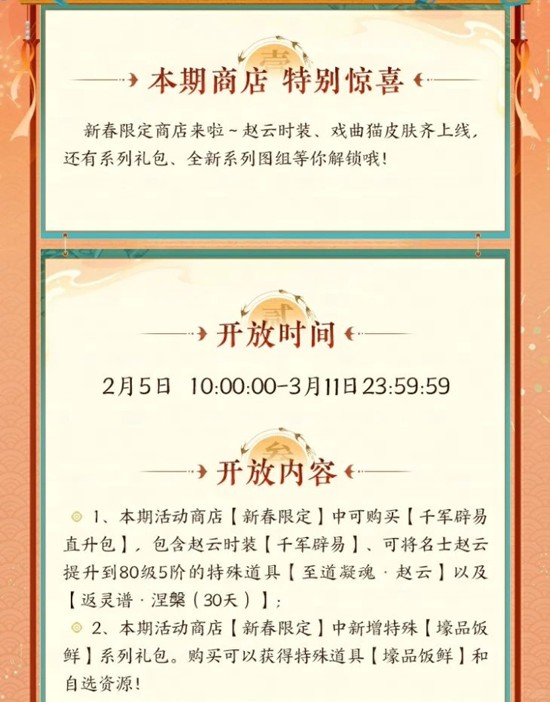 新春限定商店来啦~赵云时装、戏曲猫皮肤齐上线,还有系列礼包、全新系列图组等你解锁哦!