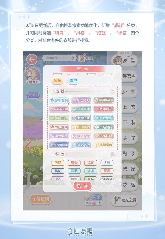 自由换装搜索功能优化,新增“成就”分类,并可同时筛选“特殊”、“风格”、“成就”、“标签”四个分类,对符合条件的衣服进行搜索。