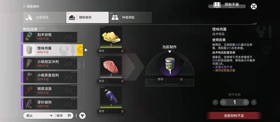 在稀有资源点边上角落有个人躺着,和他对话,给他柑实罐头可以解锁怪味肉酱的配方这个过程不会在任务列表显示哦