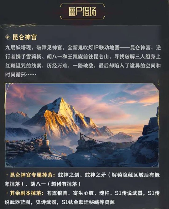 战未来S1赛季开放精绝古城与昆仑神宫两大核心猎场。精绝古城还原西域遗迹风貌,黄沙漫天中暗藏玄机,逆行者需破解机关、抵御尸潮,探寻精绝女王的秘密。