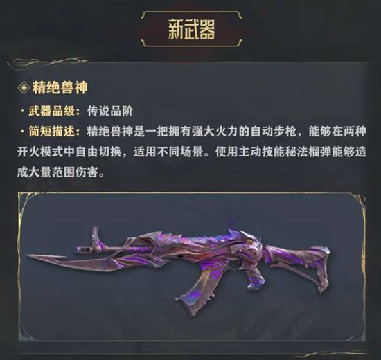 逆战未来S1赛季推出五把传说品质武器。精绝兽神以黑紫色野兽为核心,具备持续射击与榴弹射击双模式;冥河之矛采用金白色兽骨元素,可发射激光进行狙击式打击;鬼铜蚀以青铜为基调,喷涂绿色酸液造成持续伤害。战争矩阵为激光手枪,钢铁游隼具备不俗清群能力,再生冷却、春雷震、元宵来袭等武器同步上线,涵盖多种战斗场景。