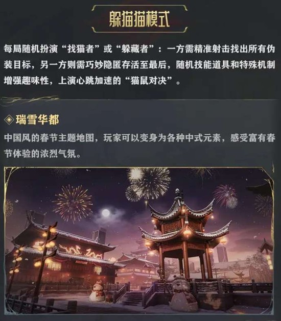 逆战未来S1赛季猫鼠模式新增瑞雪华都、熊猫之都两张主题地图。瑞雪华都呈现中式春节氛围,熊猫之都则以国宝为主题,逆行者可在欢乐场景中体验非对称对抗乐趣。