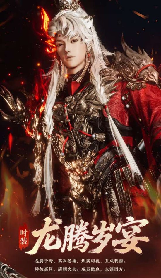 燕云十六声龙腾岁宴以"龙腾于野,其岁晏康"为主题,红色衣袍翻涌如焰,肩上神龙昂首似携御火之势腾跃而出。龙角面饰灼灼生辉,尽展威镇四方的气势。挥师所指处龙威所至,永镇四海晏康。套装支持上下装拆分与染色,包含异瞳妆容,并附赠主角动态头像。