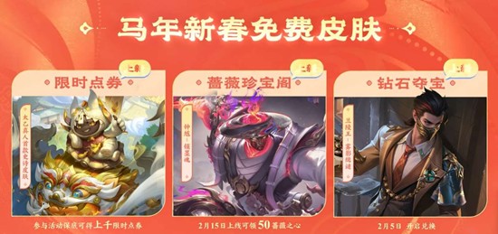 2月15日登录送三重好礼:666限时点券、蔷薇之心×50、暴击夺宝券×20。限时点券可在商城兑换太乙真人首款史诗皮肤,蔷薇之心可用于珍宝阁兑换钟馗-锁墨魂全新史诗皮肤,暴击夺宝券幸运值可暴击,更快获得大奖。