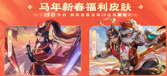 2月15日两款新春福利皮肤【吕布-舞狮寰】与【敖隐首款皮肤】开启60点券限时秒杀,性价比极高。