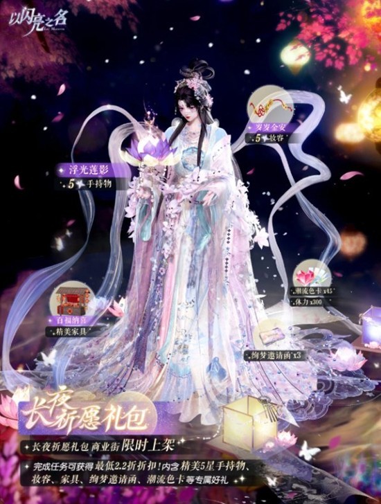 长夜祈愿礼包售卖期间,合伙人可以完成限定任务获取礼包折扣。完成全部4个任务可降至最低折扣2.2折!超值优惠不容错过!礼包内含限定五星手持【浮光莲影】、五星妆容【岁岁金安】、精美家具【百福纳喜】、绚梦邀请函*3、体力*300和潮流色卡*45,该礼包永久限购1次。