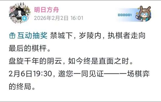 2月6日晚上7点半,无论博士是蹲直播还是等回放,这场"棋弈终局"都值得一看,以上就是明日方舟春节前瞻直播时间及内容预测。更多游戏资讯,攻略内容敬请关注切游网,您的支持是我们努力的动力!