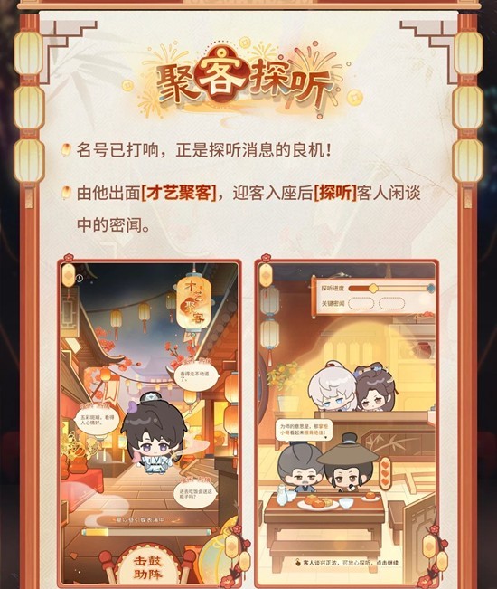 由他出面才艺聚客,迎客入座后即可探听客人闲谈中的密闻。