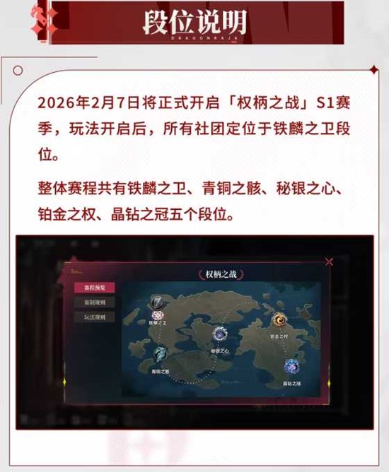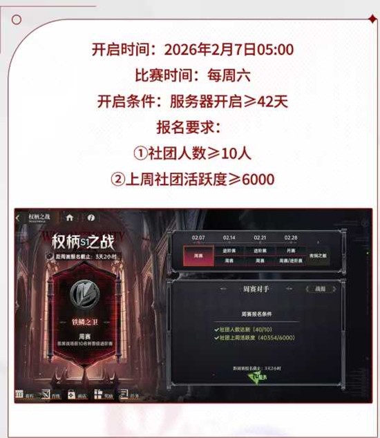 龙族卡塞尔之门权柄之战S1赛季定于2026年2月7日05时00分正式开启,此后每周六进行比赛。想要参与的专员需要注意,服务器开启时间必须大于等于42天方可解锁该玩法,且社团需满足人数不少于10人、上周活跃度达到6000点以上两项硬性指标才能成功报名。